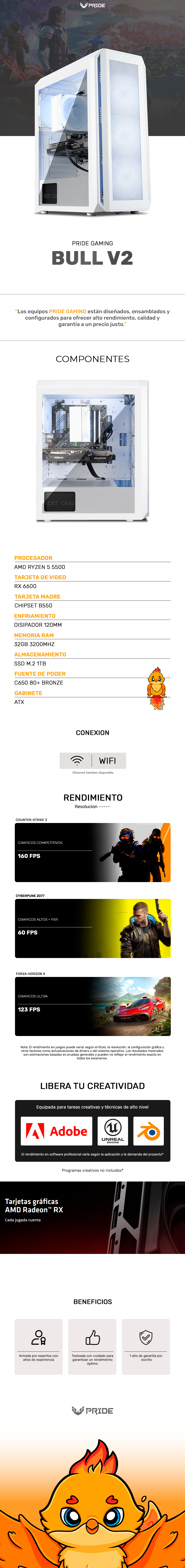 Computadora PRIDE GAMING Bull / AMD Ryzen 5 5500 / RX 6600 / 32GB RAM / 1TB SSD M.2 PCIe / 650W 80+ BRONZE / INCLUYE WIFI Y BT