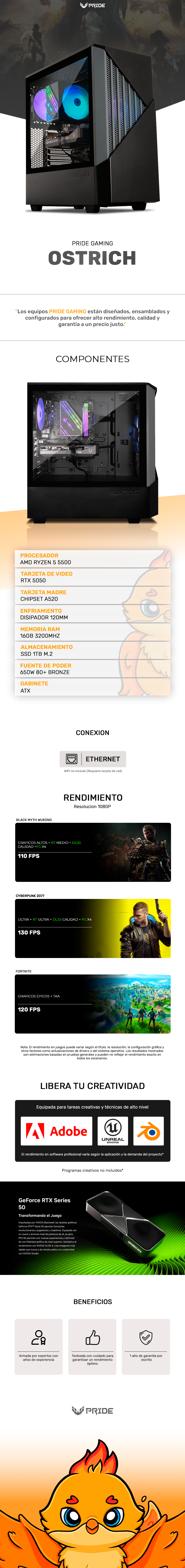 Computadora PRIDE GAMING OSTRICH V4 / AMD Ryzen 5 5500 / RTX 5050 8GB / 32GB RAM 3200MHZ / 1TB SSD M.2 / 650W 80+ BRONZE / INCLUYE WIFI Y BT