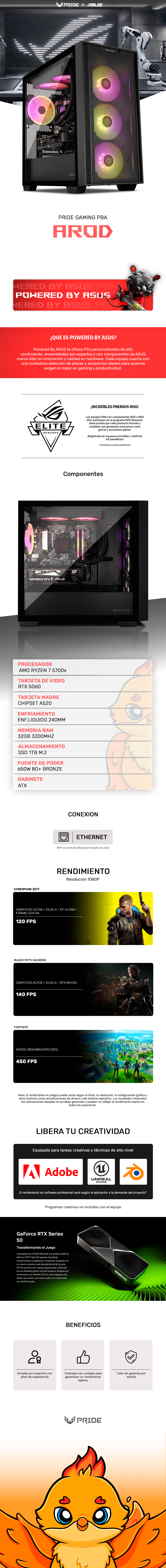 Computadora PRIDE GAMING PBA AROD / RTX 5060 / AMD RYZEN 7 5700X / 32GB RAM 3200MHZ / SSD M.2 1TB / 650W 80+ BRONZE /