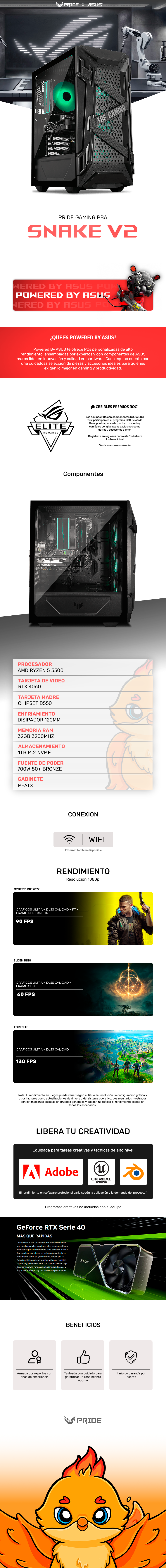 Computadora PRIDE GAMING PBA SNAKE V2 / NVIDIA GeForce RTX 4060 / AMD Ryzen 5 5500 / 32GB RAM 3200mhz / 1TB M.2 NVME / 700W 80+ BRONZE / INCLUYE WIFI Y BT