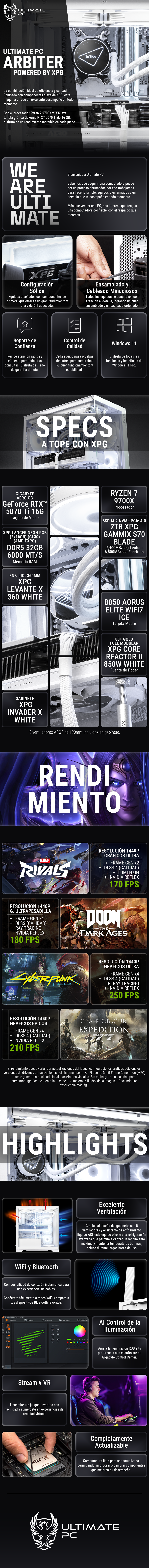 Computadora ULTIMATE PC ARBITER / POWERED BY XPG / RTX 5070 Ti 16GB GDDR7 / AMD Ryzen 7 9700X / 32GB RAM DDR5 / 2TB SSD M.2 PCIe Gen4 / 850W 80+ GOLD / WiFi y Bluetooth / Licencia Windows 11 de regalo / XPGULT / RTXS50