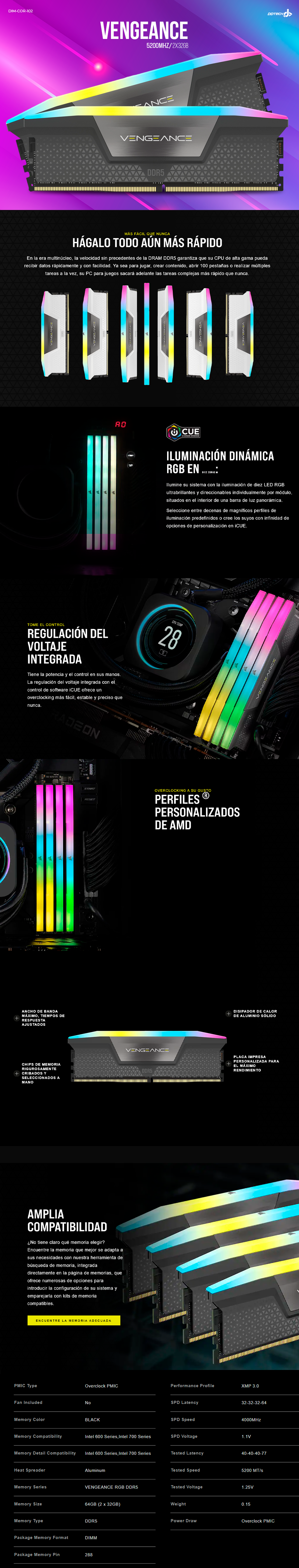 Memoria RAM Corsair Vengeance RGB DDR5 / 5200MHz / 64GB (2x32GB) / CL40 / XMP / CMH64GX5M2B5200C40