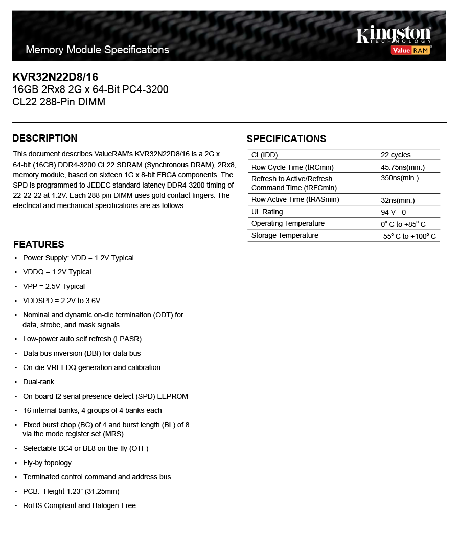 Memoria RAM Kingston ValueRAM KVR32N22D8/16 / DDR4 / 3200MHz / 16GB / Non-ECC / CL22 / KVR32N22D8/16