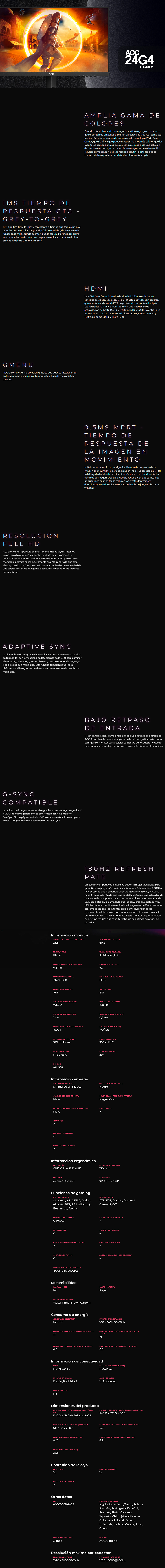Monitor Gamer AOC 24G4 / LED / 23.8" / 1920x1080 Full HD / G-Sync / 180Hz / 0.5ms / HDMI/DisplayPort / Negro/Rojo / 24G4