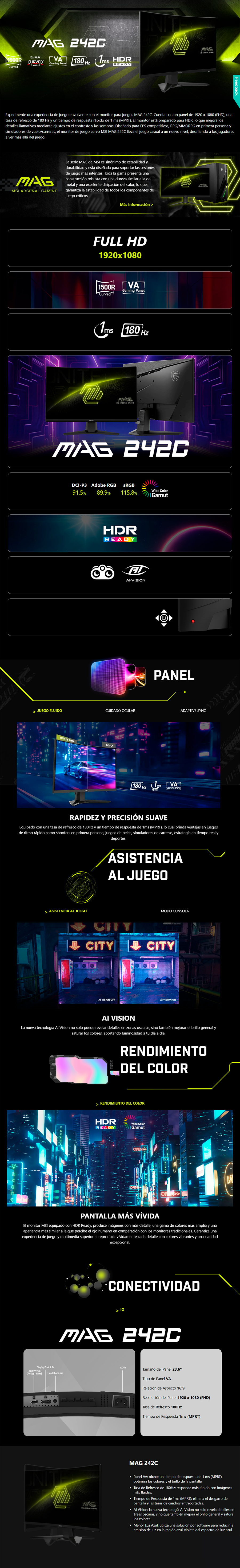 Monitor Gamer Curvo MSI MAG 242C / 24” / FHD / 1920x1080 / 180hz / HDMI/DisplayPort / Negro / MAG 242C