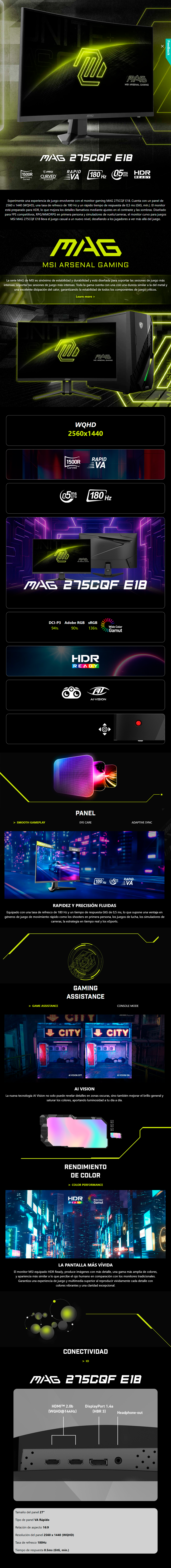 Monitor Gamer Curvo MSI MAG 275CQF E18 / LED / 27" / 2560x1440 / 180Hz / HDMI/DisplayPort / Negro / 275CQF E18