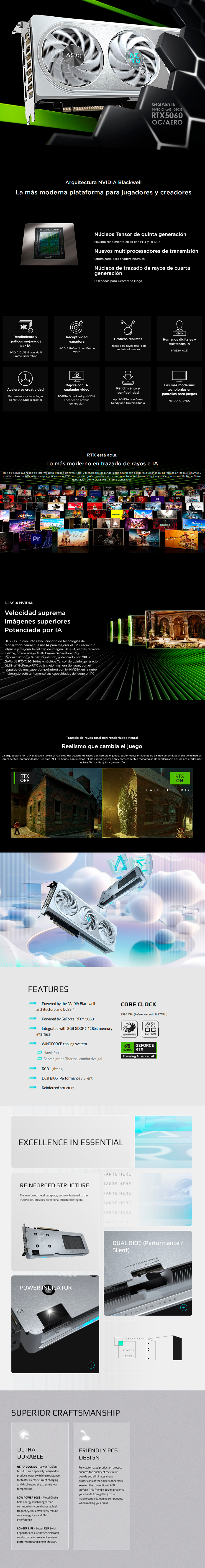 Tarjeta de Video Gigabyte NVIDIA GeForce RTX 5060 AERO OC Edition / 8GB 128-bit GDDR7 / PCI Express 5.0 / GV-N5060AERO OC-8GD